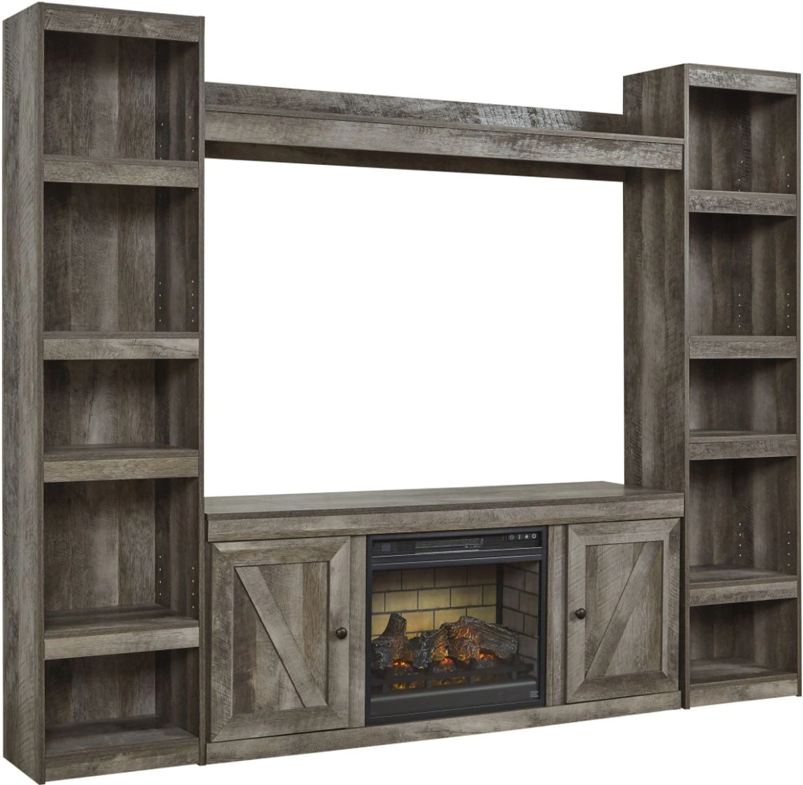 Ce centre de divertissement avec cheminée encastrable ne manquera pas de gagner votre cœur grâce à sa conception audacieuse de la vie à la campagne. Son profil net, épuré et minimaliste est enrichi d'une finition grise, d'un grain de chêne répliqué saisissant et d'un style de planches épaisses pour un caractère encore plus authentique. Les détails de l'arbalétrier ajoutent une touche brillante inspirée des portes de grange.Read More