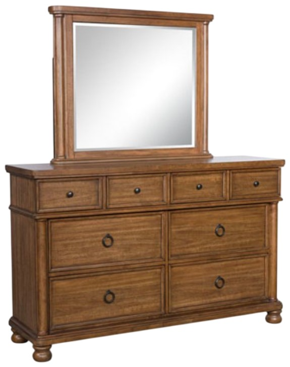 Cet ensemble commode et miroir offre un rangement pratique avec une finition brun chaud qui ajoute une touche d'élégance à n'importe quelle chambre à coucher. Conçu pour durer, il comprend des tiroirs à glissières fluides et un miroir assorti qui complète le look avec une présence cohérente et élégante.Read More