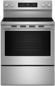 Profitez d'un éventail de possibilités avec cette cuisinière électrique KitchenAid. Elle offre une capacité spacieuse de 5,3 pi cu et le préchauffage rapide permet à votre four d'atteindre la température de 350°F en moins de 8 minutes*. Cet électroménager intelligent est doté de deux éléments Even-Heat™ Hyper et de modes de cuisson à convection vous aidant à obtenir des résultats uniformes. La convection véritable Even-Heat™ dotée d’une conception unique en nœud papillon avec un élément chauffant et un ventilateur qui fait circuler l’air chaud dans tout le four, procure des températures constantes pour des pâtisseries croustillantes et feuilletées, des rôtis juteux et uniformément dorés et des légumes savoureux et caramélisés.Read More
